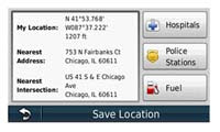 Simply tap the screen for your exact coordinates, the nearest address/intersection, and the closest fuel and emergency services. |